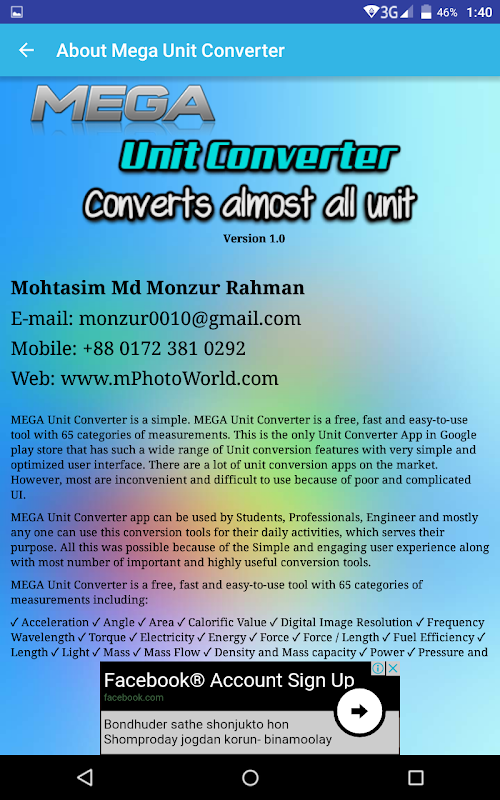 MEGA Unit Converter is a simple. MEGA Unit Converter is a free, fast and easy-to-use tool with 65 categories of measurements. This is the only Unit Converter App in Google play store that has such a wide range of Unit conversion features with very simple and optimized user interface. There are a lot of unit conversion apps on the market. However, most are inconvenient and difficult to use because of poor and complicated UI.