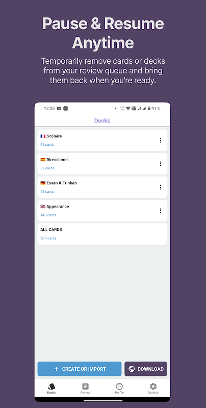Temporarily remove decks or cards from your review schedule and bring them back when you’re ready—no lost progress.
