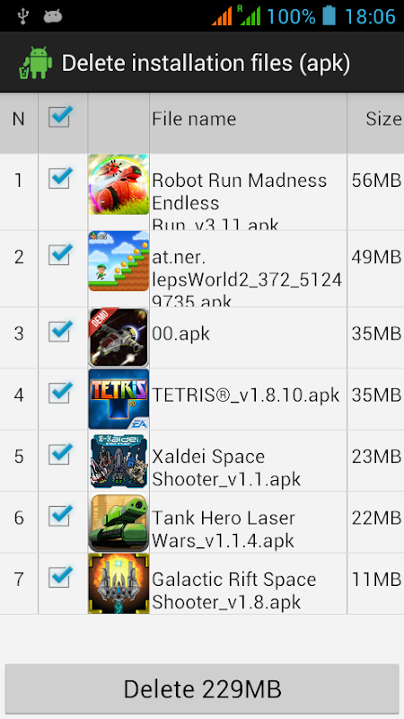 It is no secret that over time accumulates a plurality of installation APK files downloaded from the internet and occupy too much memory. Just press one button and the application will find all APK files on your device. You can view a sorted list of files, and check those that will be removed.