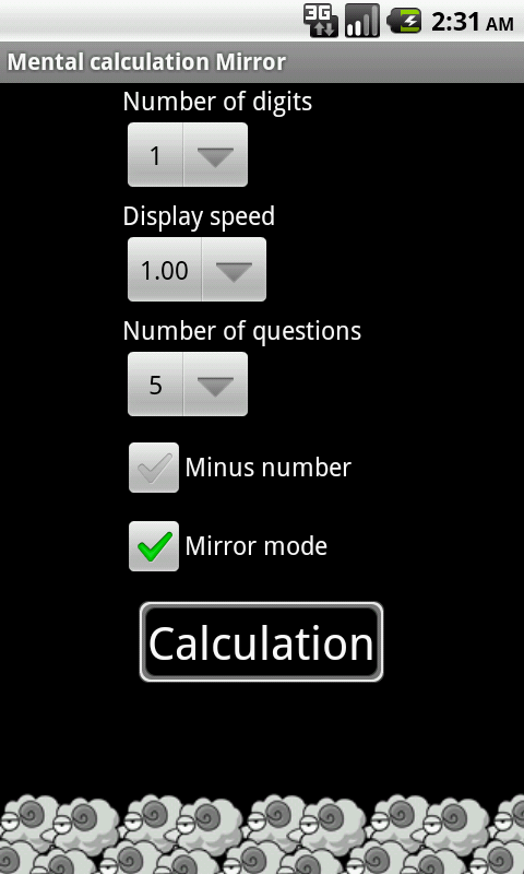 You can make a flash mental calculation by specifying the number of digits, display speed, number of questions, minus the presence or absence, the mirror character.