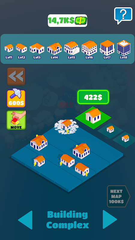 Buy new building, merge with other 2 buildings to reach top level buildings!