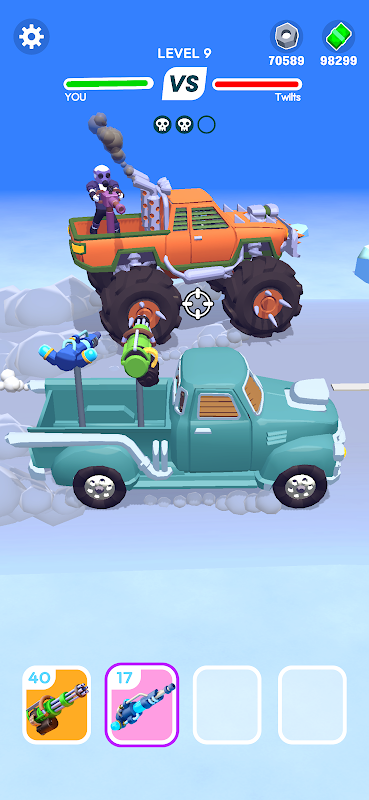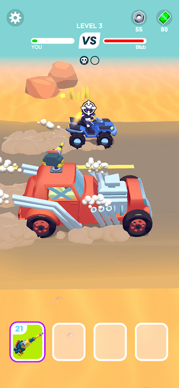 Merge parts and weapons to upgrade your car for thrilling race battles.