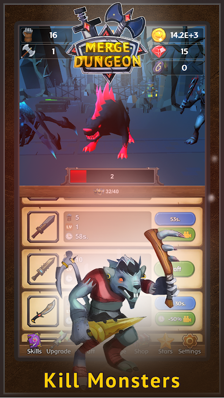 ★ Fight monsters in the dungeon, merge weapons to get new ones and defeat strong bosses.
