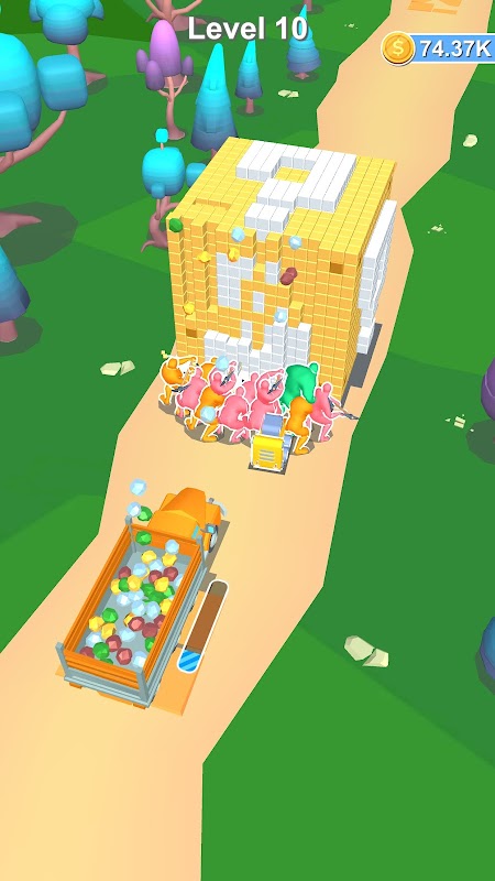 Once the mining cart is full, the level ends, and a settlement interface pops up. After closing the settlement interface, a synthesis interface appears where low-level miners can be merged into higher-level miners. Higher-level miners have different colors and become stronger as they level up. Their mining ability also increases with each level. The game features 12 levels of miner models, and levels 7-12 can be replaced with excavator models.