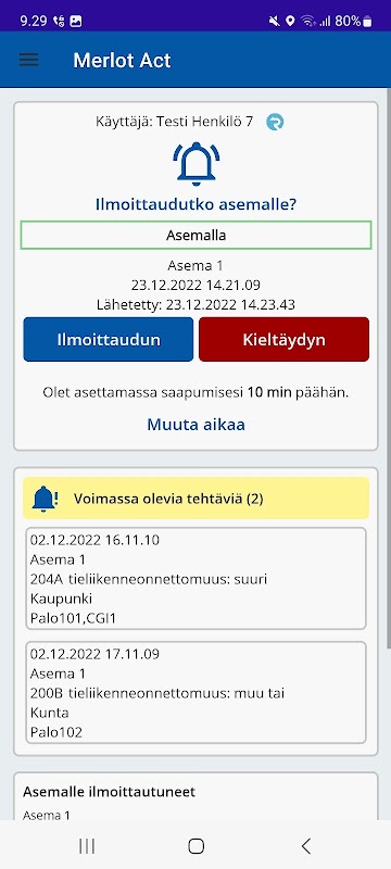The Merlot Act application is a contract firefighter's tool. In the application, the user has the option of notifying his own contracted fire department if he is available for a task assigned to his own contracted fire department. From the application, it is also possible to see real-time situational information about the number of registered users and the capabilities of registered users. The application also has the possibility to answer various queries.