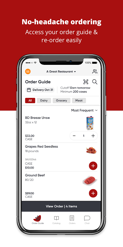 Our mobile app lets you search our complete product catalog, manage and update your ordering guide, and buy what you need at the moment you need it. It’s part of our commitment to giving you an ordering experience you’ll love.