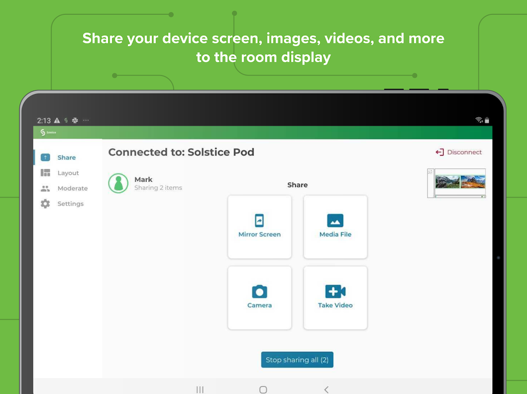 Mersive Solstice is a high-performance teamspace collaboration platform that improves the usability and productivity of meeting and learning spaces. The Solstice App enables users on any device to wirelessly share, control, and mark up unlimited content on a Solstice-enabled display to drive more efficient, engaging, and collaborative meetings.