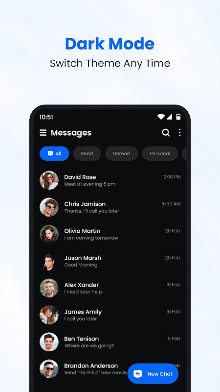 Style your messaging app with dark mode and multiple theme options. Personalize fonts, colors, and chat bubbles the way you like.