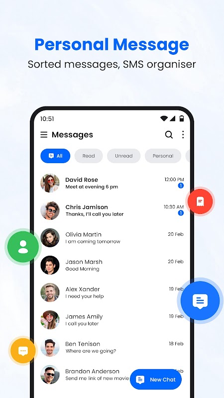 Stay connected in 2025 with the smart, fast, and secure texting app — Messages: SMS Texting App 2025! Whether you're chatting with friends, our lightweight SMS app offers a beautiful, simple interface with powerful features designed for everyday communication.