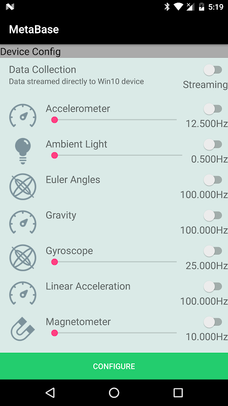 The app configures your MetaWear boards to log data from the on-board sensors, retrieving the data at a later time, or stream it live to your Android device. Users can upload the saved data to any file managing app such as Google Drive and Dropbox, email the data to themselves, or sync the data to MbientLab's MetaCloud service.