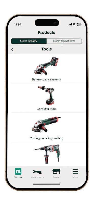 Of course, the Metabo app also helps you find a nearby Metabo dealer quickly. You will also enjoy other features, such as our product catalog, registration code scanning, and much more.