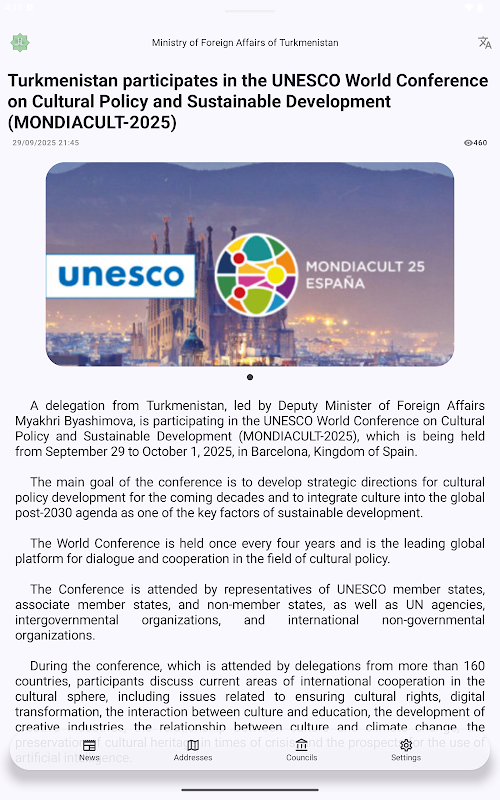 Mobile Application of Ministry of Foreign Affairs of Turkmenistan where you can read recent news about foreign affairs of Turkmenistan. You can see the embassy address list