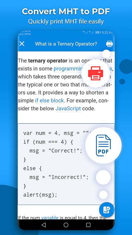 Through this app you can convert MHT to PDF and can also take a print out of MHT file or from the pdf file. MHT/MHTML Viewer can also be used as pdf viewer because it will load the pdf files from your device storage and can be easily viewed within app, so MHT to PDF convertor can be used as pdf viewer.