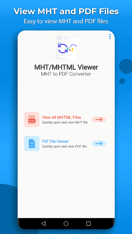 MHT file viewer is the best tool for reading saved sites and articles and also a best pdf viewer app through which you'll create pdf files from MHT files and also view all pdf files that are saved on your device. MHTML reader and MHT viewer is a free app through which you'll read MHT and pdf file and also share it on any social platform easily.