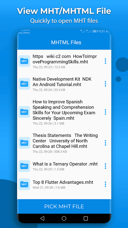 The main purpose of the app is to view the files that having MHT or MHTML extension, so that it become readable and it is also used to view PDF files.MHT/MHTML Viewer will read all MHT or MHTML Files and can also be used as pdf viewer and show all pdf files that are saved on your device and preview within app easily. MHT to Pdf can be used to convert MHT file to pdf. You can view any MHT file or pdf files at any time even if you don’t an internet connection.