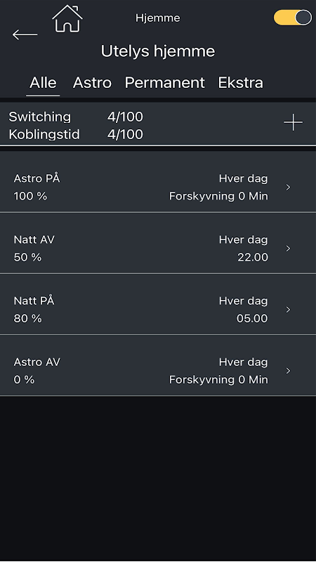 With the app, you configure the units with the various functionalities you want to use, for example astro weekly with or without dimming, and possibly program a weekly schedule with various events and night shutting down. In addition, it is possible to directly override devices from the app as long as you are within range of up to 75 meters (clear view), or about 10m indoors.