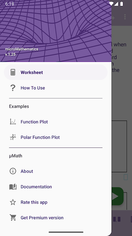 microMathematics supports basic level of mathematical calculations. If you find microMathematics useful or need more mathematics (like plots for several functions, 3D plots, summation and product operations, derivative and definite integrals, logical operators, units), please consider purchasing the premium version to support further development. Thank you.