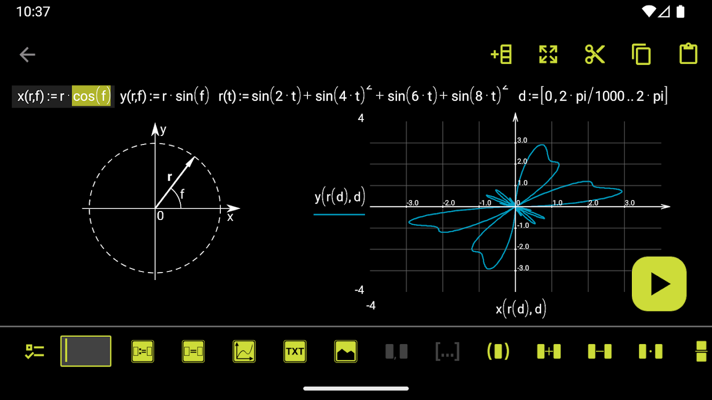 microMathematics is a revolutionary new kind of mobile calculator. It is the world’s first scientific graphing calculator and function plotter on Android oriented around a worksheet. It allows live editing of mathematical identities combined with highly accurate computations.