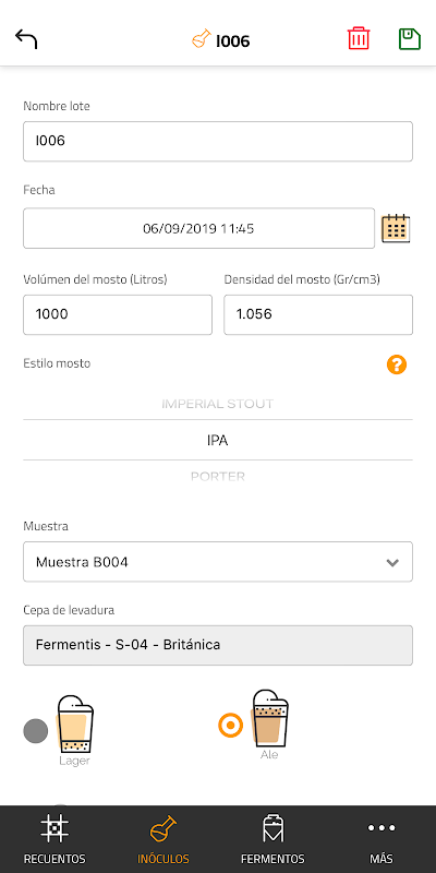 The application allows you to calculate the volume of cream that you have to inoculate in your next batch, as well as keep a record of it. Entering the volume of the batch to be inoculated, the initial density, the inoculum rate and selecting the cream that you are going to use (calculated in the Count section) calculates the volume of cream necessary to have a good fermentation.