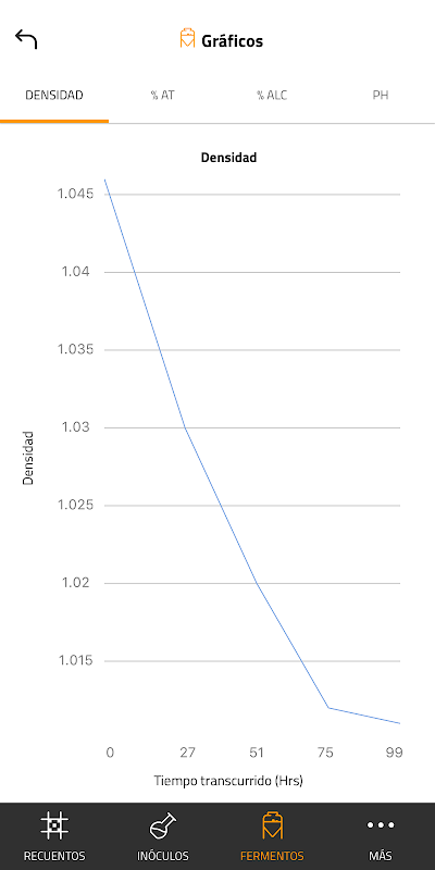 The application allows you to monitor fermentations through the periodic loading of density, pH and temperature data. The graphs obtained from these variables as a function of time are extremely important when it comes to standardizing fermentation and detecting possible problems that may have an impact on the quality of the final product.