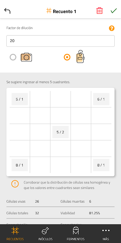 In this section you will be able to perform yeast counts using the improved or traditional Neubauer chamber. For each count you will be able to obtain important information when it comes to standardizing yeast management in your factory, it allows you to enter the name of the sample, the batch number, the yeast strain (more than 60 loaded strains and the possibility of entering yours) as well as the origin of it. The count can be performed by observing under a microscope using a manual counter. Or you can also take photos of the neubauer camera quadrants, using a microscope cell phone holder, and count directly on the photo. In this section you can take photos from the application or use images from the gallery, if you cannot finish the count at the moment, you can save and continue the count later.