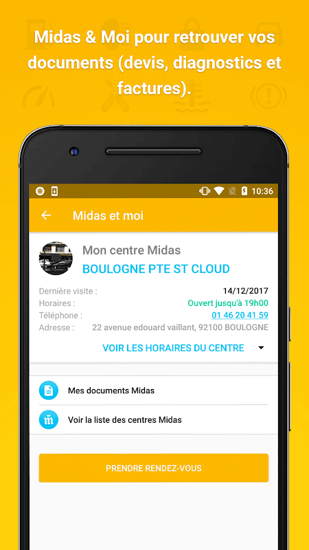 - In space "Midas and me," Access all your Midas documents (quotes, invoices and diagnostics) and locate the nearest center to get there, contact or appointment.