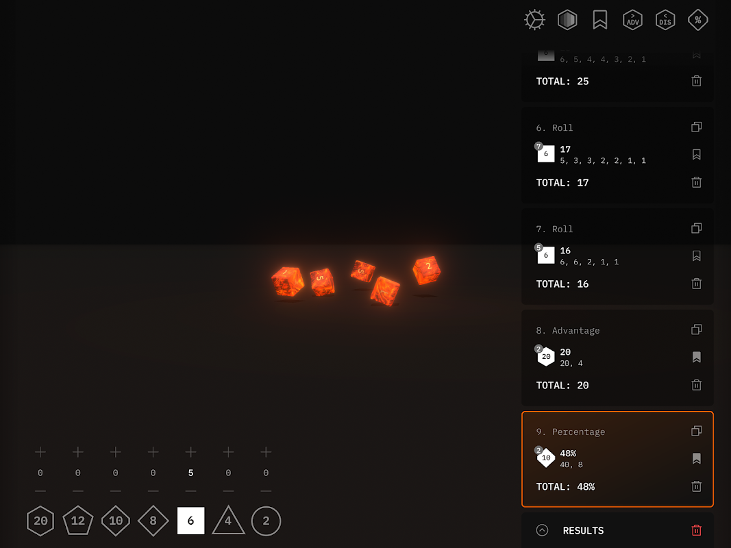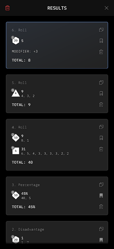 - View a breakdown of all previous rolls made during your current session. Each roll in your history can be quickly rerolled, saved as a preset, or copied in a text based format.
