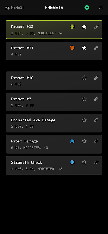 - Save and sort dice presets for your most frequently rolled dice. A preset can include any number of dice, modifier, or specific dice skin.