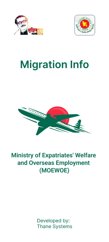 Migration Info is a digital platform by the Ministry of Expatriates' Welfare and Overseas Employment, built to guide aspiring Bangladeshis providing necessary data and facts for migration abroad. The System has been developed for a user's convenience in terms of finding out the necessary information. Currently, the app offers information regarding passport offices, recruiting agencies, DEMO offices, medical centers, training centers, Bangladesh embassies, etc.