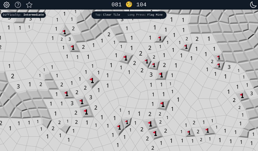 This version of Minesweeper comes with a twist, where the grid is irregular. On a regular grid, each cell has always 8 neighbors, but in this case, they can have between 6 and 10. This leads to more difficult games, as you can't build the same mental tricks to solve where the mines are.
