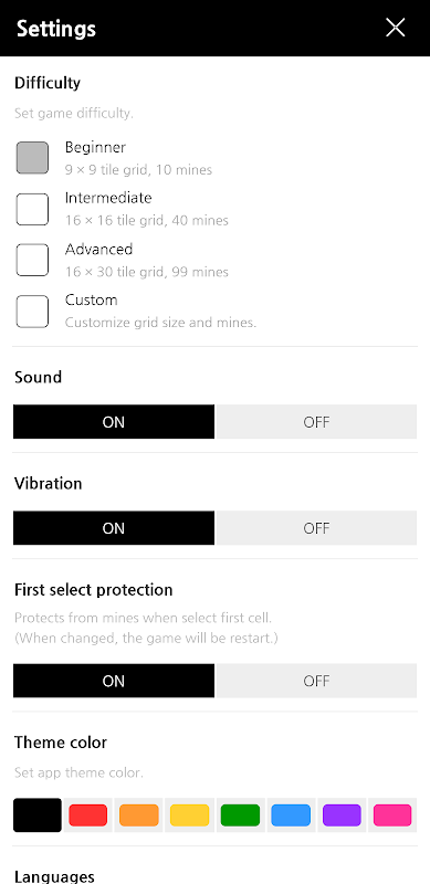 - Custom : Can freely set the grid size and number of mines. Maximum grid and mines are limited by the device size.