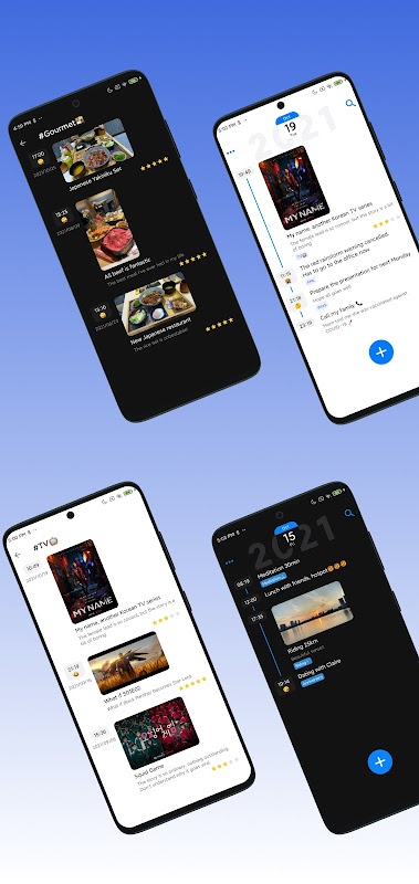 Inspired by "Daybreak Diary", "Nine Square Diary" and "Bullet Journal”, we have incorporated the idea that "every moment in life is worth recording" into Minimal Diary, which allows you to record every interesting things that happens at present, such as good songs, unforgettable movies, delicious food, and general living.