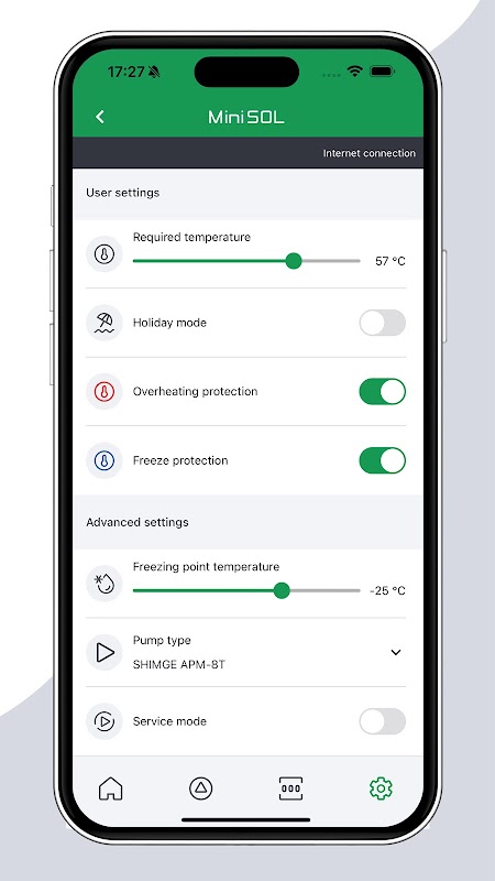 The MiniSOL app allows for easy management of a solar installation with the MiniSOL controller. The user can quickly configure the connection, adjust settings, and monitor energy production and operating time (for SHIMGE pumps).
