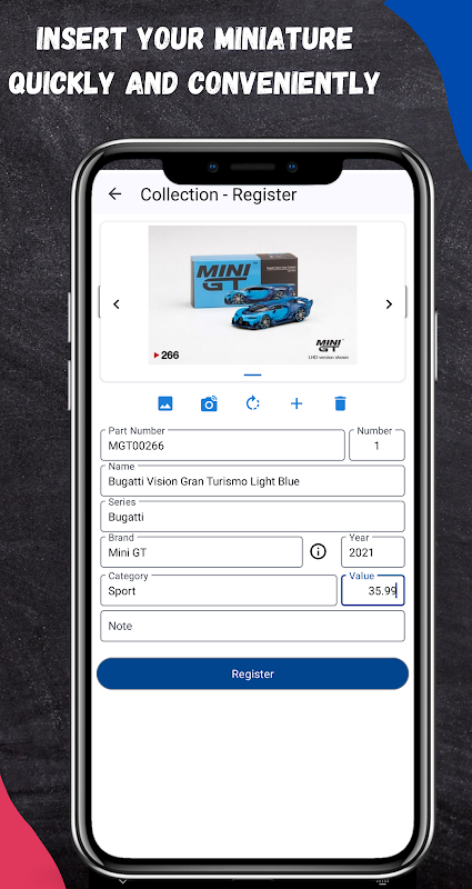 Organize and manage your miniature collection with ease and style. With MiniWheelsPro, your collection is always at your fingertips, ready to be consulted anytime. Whether you want to avoid duplicate purchases, trade items with other collectors, or simply admire your collection, MiniWheelsPro is the perfect companion for every miniature enthusiast.