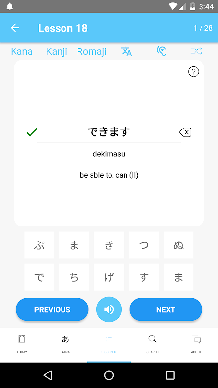 - "Learn": remember each word and phrase by heart, type in the corresponding hiragana to the word or phrase pronounced. This exercise can train your listening, reading and writing. There are 2 learning modes, you can test yourself in the same vocab sequence as shown in the lesson or in a random sequence. You may also practise with hints provided.