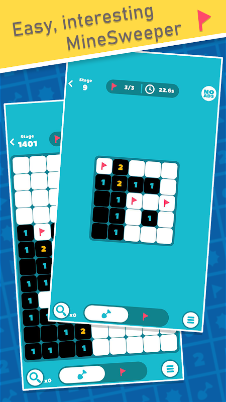 The game is full of thrill while it is quite a simple rule. If you can't find out the location of the mine block in spite of the appeared number, you should choose the safe block by your own sense. Through various and complicated stages, you can enjoy a more upgraded-level game than the classic minesweeper game.