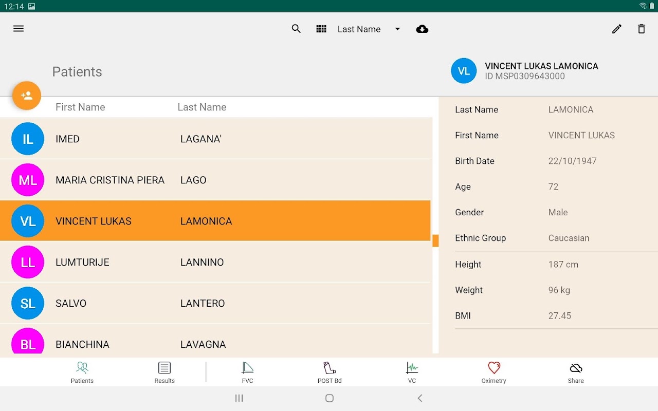 - Spirometry Parameters: FVC, FEV1, FEV1 %, PEF, FEF25–75, FET, ESTIMATED LUNG-AGE (adult), EVC e IVC.