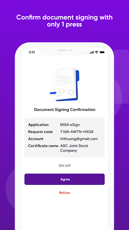 With MISA eSign, users can easily sign documents from mobile devices without the need for USB Token, SmartCard or any other hardware device. Digital signatures are completely trusted with the European standard eIDAS.