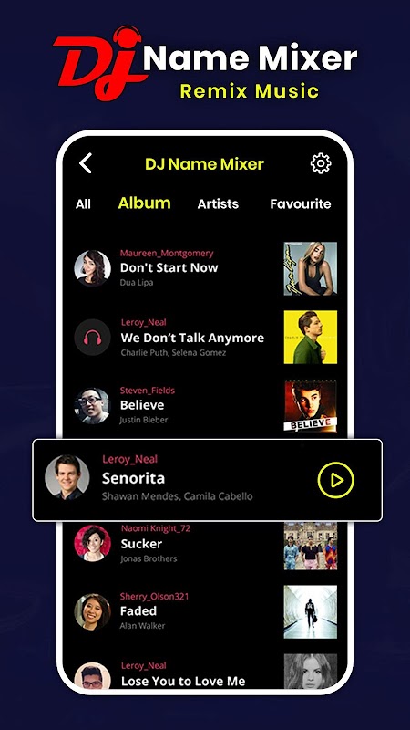 DJ Name Mixer in Song is the party making app for late night party lovers! Play this featured free version of DJ mixer. Mix your normal songs and mix it like the remix one. Free download this mixing app and mix songs for your dance party. Mix songs from your phone or tablet and mix it with existing available DJ tracks!
