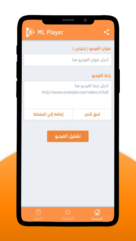 - الصفحة الرئيسية : تستطيع من خلالها إضافة رابط الفيديو m3u8 وتشغيله داخل تطبيقنا مباشرة.