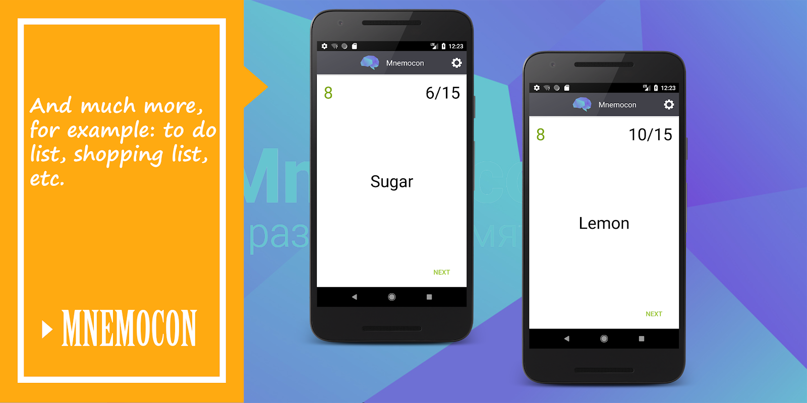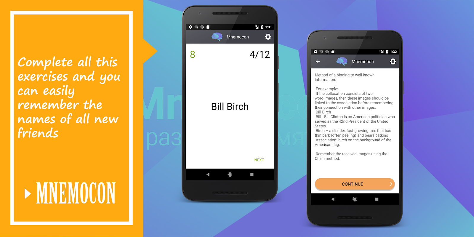 The application build on the great course of brain exercises to learn techniques for fast and quality remembering the information. Mnemocon include the most effective memory techniques - mnemonics.