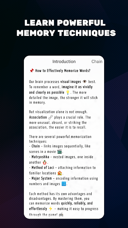 Memorizing words is a natural and effective way to develop memory. Understanding the principles of how your brain works and methods of creating artificial associations will increase the capacity of your memory. Game levels are designed "From small to large", for the people who are just getting acquainted with mnemonic techniques. That's why brain training with this game will bring you only pleasure.