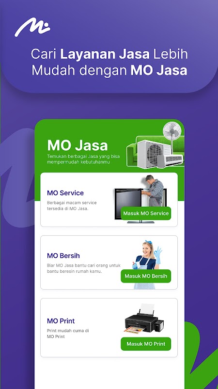Starting from services, reservations for sports facilities, buying game vouchers and making various payments in one app. If you need services to help you do household chores, MOaja has solutions! Various professional services are available on the MO Services feature. Such as cleaning services, washing shoes, carwash, and air conditioning services.
