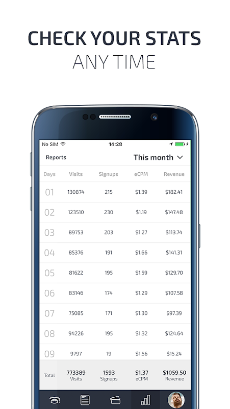 • Explore stats and reports to be able to check your earnings 24/7.