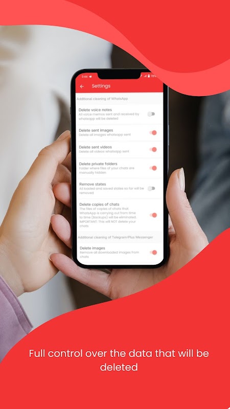 The main functionality of Phone Cleaner & Cache is focused on cleaning hidden files generated by various messaging applications, thus ensuring that your privacy is protected. These files, which often get stored on your phone without you realizing it, can take up considerable space. Mobile & Cache Cleaner identifies and deletes them safely, freeing up valuable memory on your device.