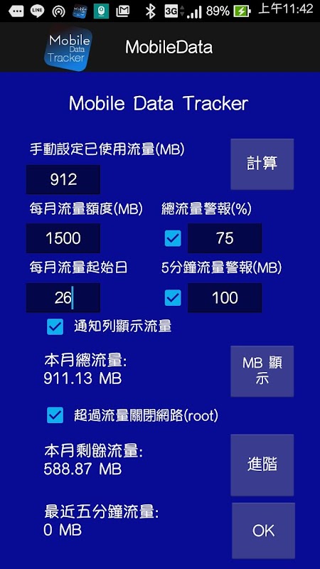 沒root也沒關係,APP提供了足夠明顯的方式告訴你超過流量了,你可以手動關閉行動數據