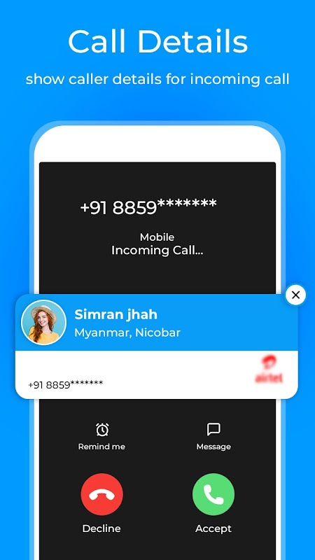 Identify, Block Incoming Calls Offline & get call details like city name, state, operator and country.