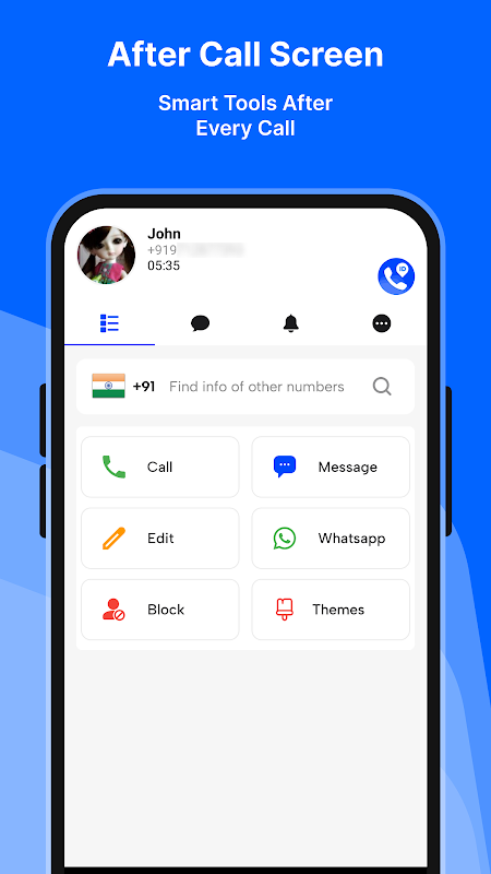 "After Call Screen” in Mobile Number Tracker – CallID lets you instantly access essential actions right after a call. With a single tap, you can call back, send messages, open WhatsApp, edit or block contacts, and change your caller screen theme—making post-call management fast, simple, and convenient.