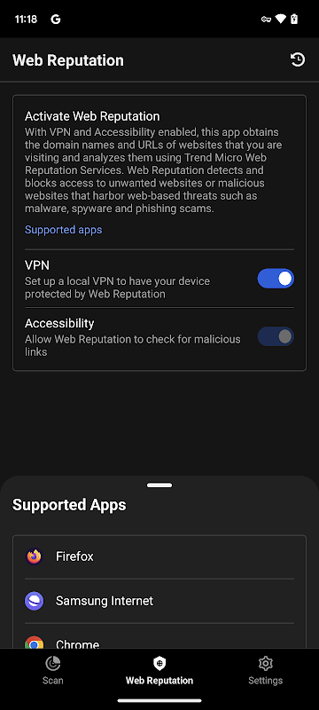 Mobile Security requires the Accessibility permission in order for Web Reputation to obtain URL information from browsers and instant messaging apps, check URL reputation, and block malicious URLs.