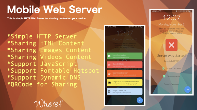 Mobile Web Server app is a Lightweight, Fast and Simple HTTP Web Server. We can show our device's content on a web page. The web page can be displayed on any platform as long as we have installed web browser. However, the content has a "download link" button, "QRCode" button and a "copy link" button that make convenience for us. If there is not enough, we also can make our customised html content by sending a html file to the Mobile Web Server app.